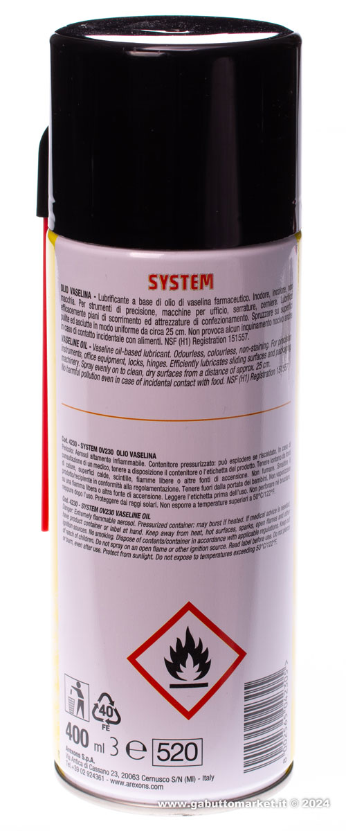 OLIO VASELINA SPRAY SYS OV230 CERTIFICATO NSF PER ALIMENTI ML.400 AREXONS
