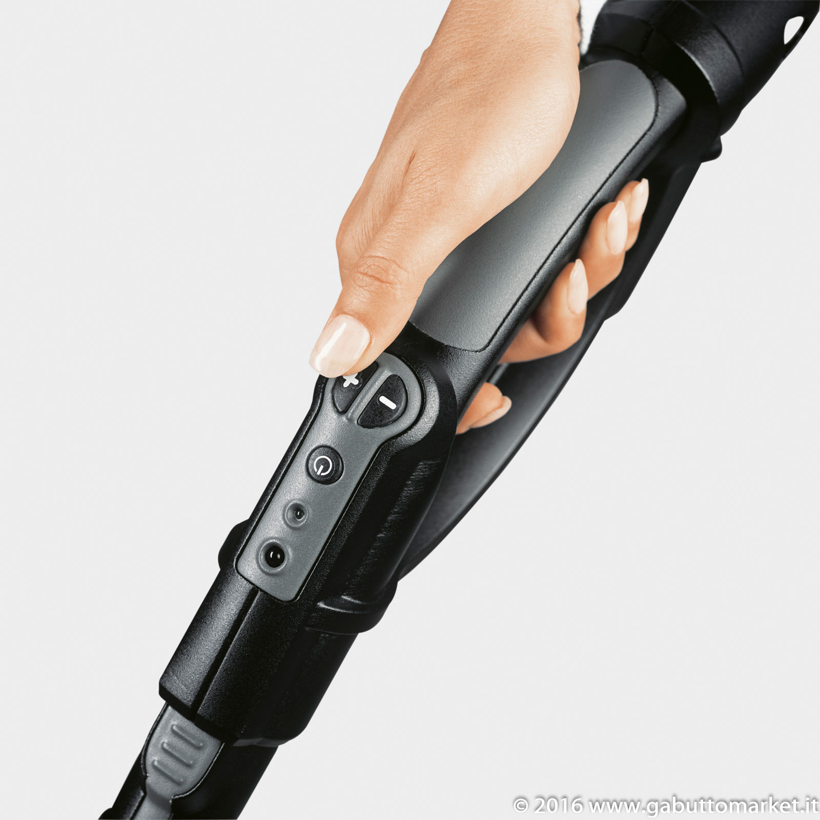 Regolazione elettronica della forza aspirante, sull'impugnatura (pulsante + / – ) con funzione stand by